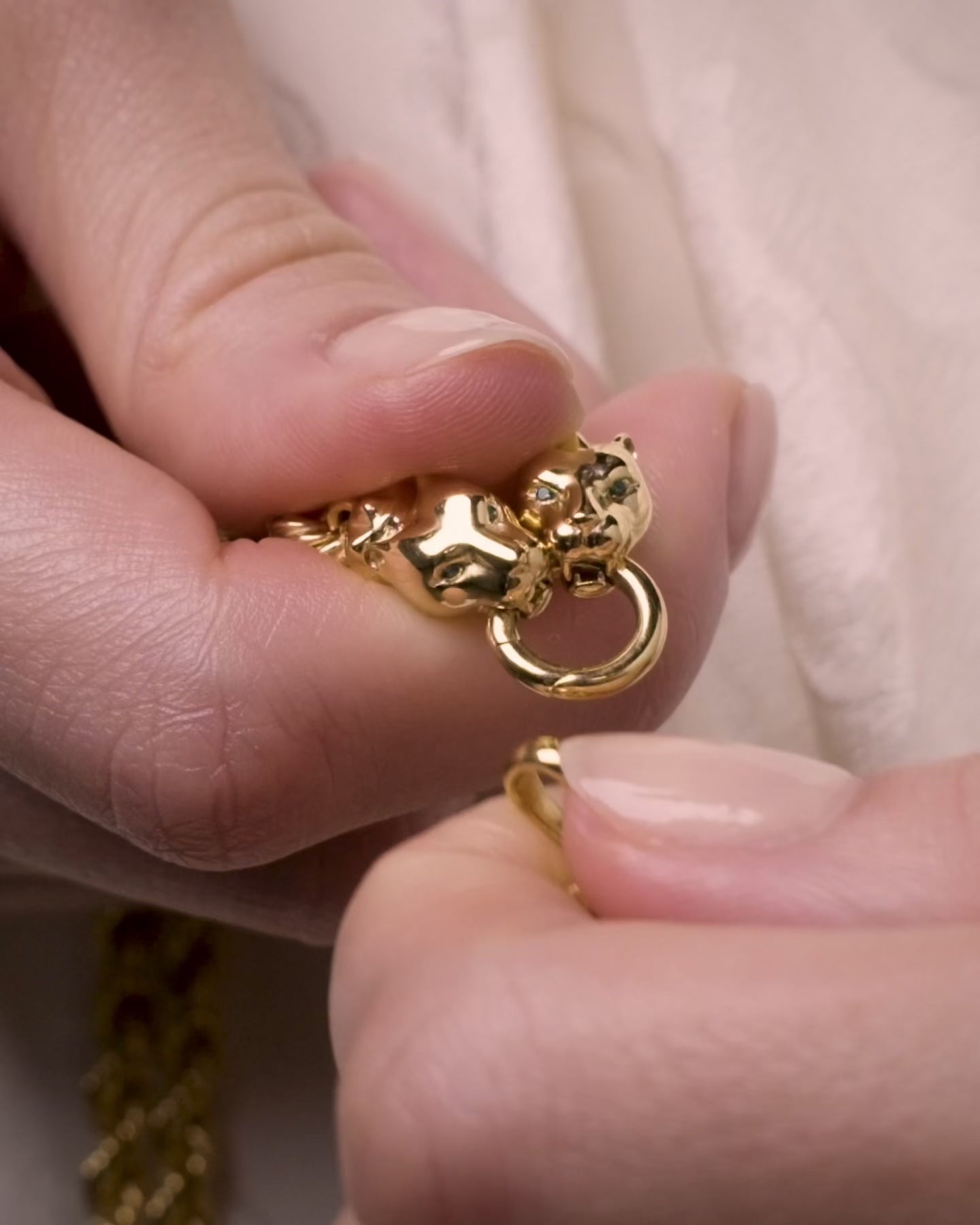 Ancient feline intelligence meets feminine duality. In ancient Egypt, Sekhmet was the lion-headed Goddess of war and medicine, both feared and respected. In contrast to her fire-breathing, warlike ways, her sister Bastet is Goddess of the home and protector of women and children, embodied by the domestic housecat. Together, they represent the full spectrum of divine femininity — and wearing their twin symbols makes space for the duality within you. Flip the Goddess pendant to wear Sekhmet facing outward when the world requires your ferocity and strength, or wear Bastet to reveal your softer side. Emeralds (for wisdom) and blue sapphires (for intuition) surround these revered Goddesses and call in what you need.