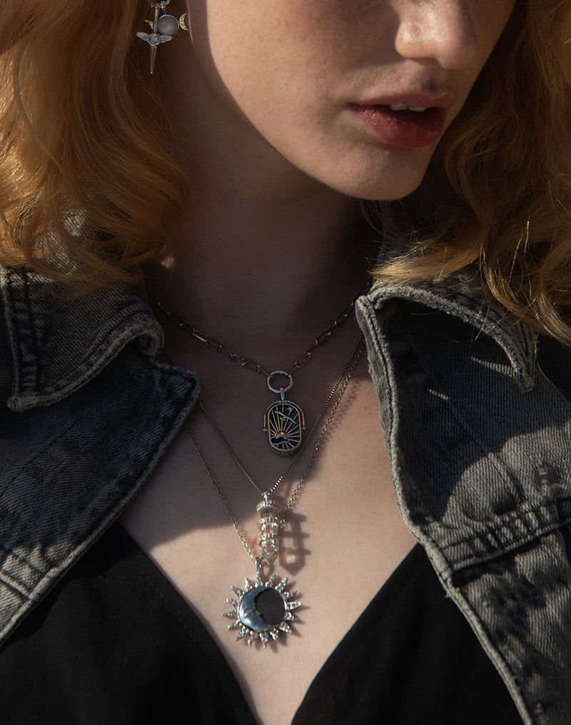 Awe Inspired Necklaces Sterling Silver / 16"-18 / Large Manifestation Crystal Necklace Close-up of a person wearing a denim jacket, a black top, and layered silver necklaces featuring a sun pendant, intricate designs, and Awe Inspired's Manifestation Crystal Necklace with clear quartz.