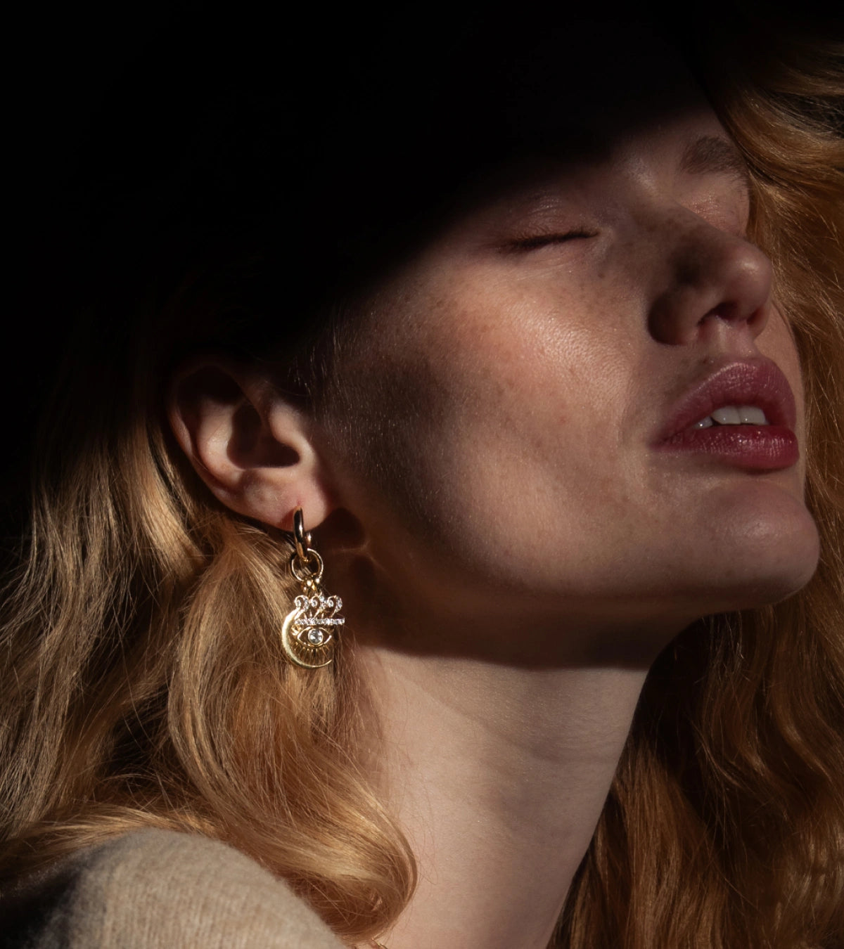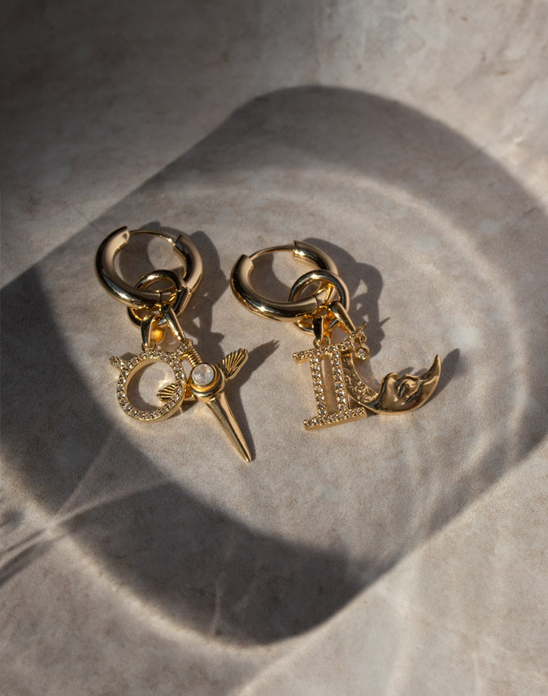 Awe Inspired Earrings 14K Yellow Gold Vermeil / Pair The Charm Collector Earrings Close-up of a person's ear adorned with "The Charm Collector Earrings" by Awe Inspired, featuring multiple charms including a small jewel and a spike. The person has light skin and blonde hair.